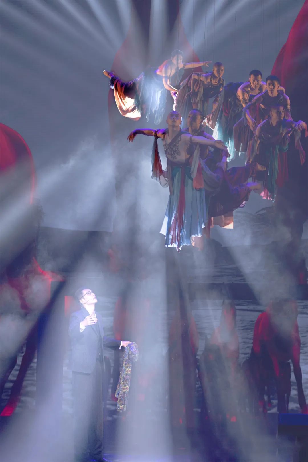 剧中“伎乐飞天”的惊艳呈现,无疑是整场演出的亮点之一。得益于梅奔中心全球领先的吊顶结构设计,多组特技演员在场馆内自由翱翔,生动再现了敦煌莫高窟的壮丽景象,将飞天艺术的静态之美与动态之韵巧妙结合。这一震撼场景不仅让观众深切感受到了敦煌文化的独特魅力,更彰显了东方艺术与现代舞美科技的完美交融。这也是自2018年《太阳马戏》演出以来,梅奔中心时隔六年再度迎来高难度特技表演,再次证明了其在硬件设施方面的卓越实力与领先地位。凭借AI、影视化、动画真人融合等最新科技打造的多维立体舞台,以及尖端数字化视听设备,敦煌的千古神韵即将在梅奔中心得到了全面绽放,成就了一场集话剧、音乐剧、演唱会于一体的多维艺术盛宴。