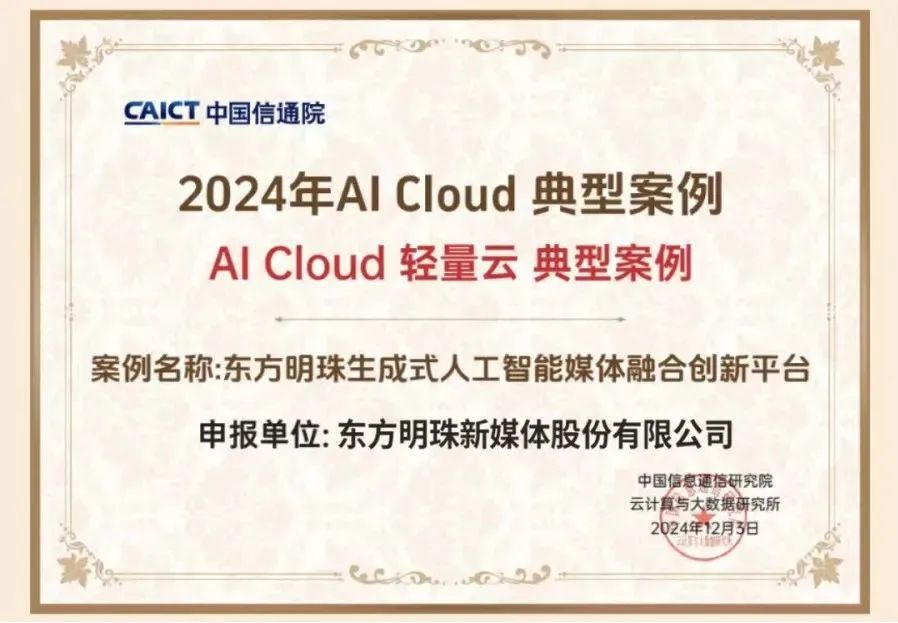 近日,由全球数字经济大会组委会主办,中国信息通信研究院(以下简称“信通院”)、中国通信企业协会承办的2024全球数字经济大会云·AI·计算国际合作论坛在北京成功召开。会上隆重发布了2024年“AI Cloud助力大模型场景化和工程化落地”典型案例评选结果,东方明珠新媒体股份有限公司的生成式人工智能媒体融合创新平台荣获2024年度AI Cloud轻量云典型案例。