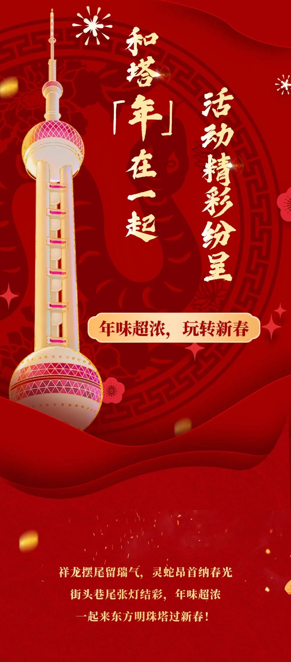 东方明珠塔与“毛茸茸派对”IP的强强联合,打造“蛇来运转”主题互动装置、年味十足的互动游乐区及年轻人喜爱的治愈系东方明珠塔ד毛茸茸派对”限定玩具。这个春节,来东方明珠塔体验年味十足的“毛茸茸派对”吧!