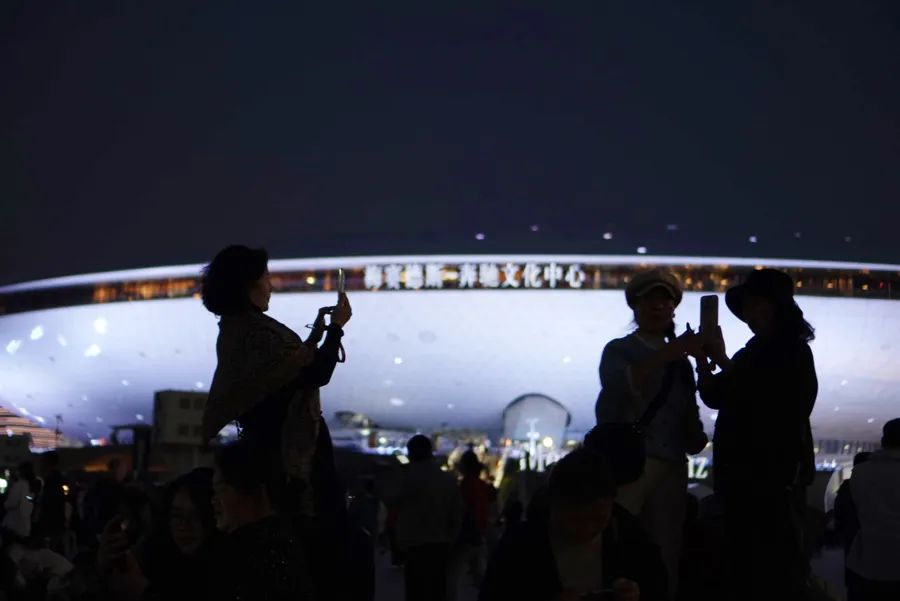 几位观众在梅赛德斯-奔驰文化中心门口拍照留影