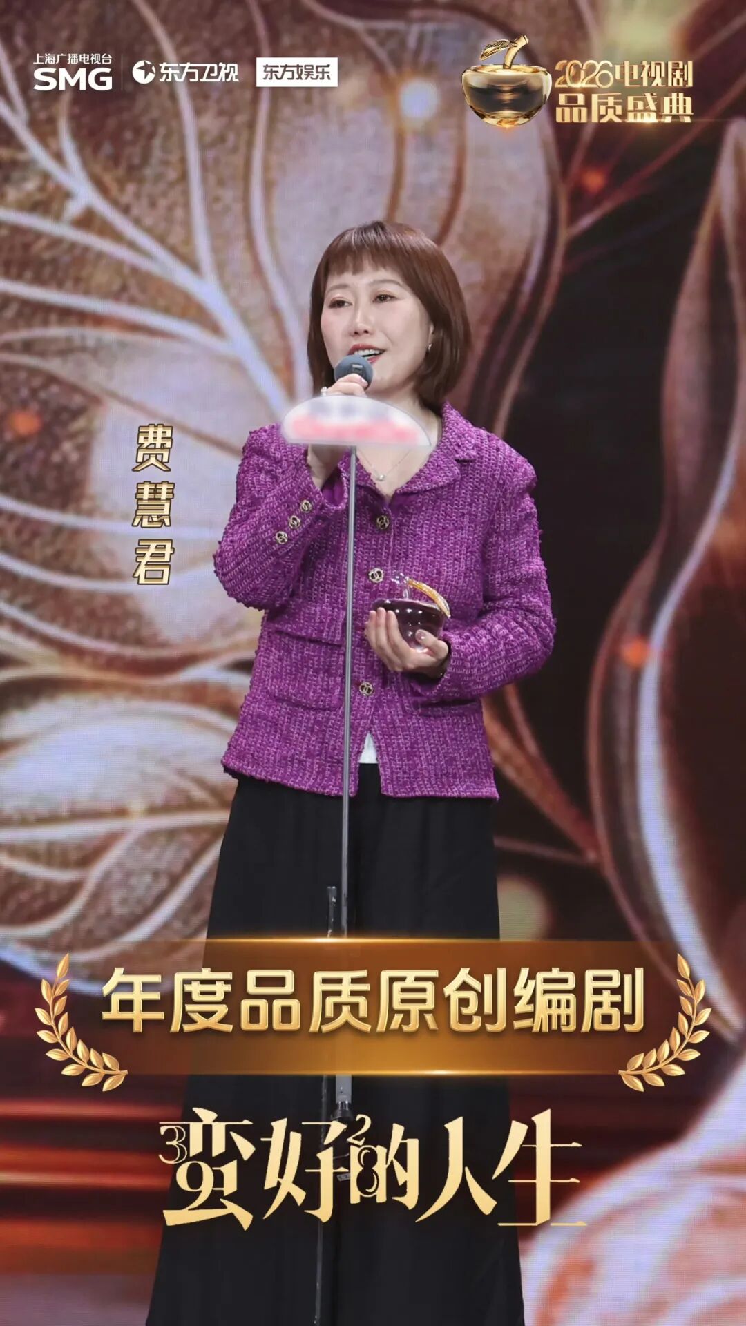 在创作上,导演汪俊以细腻克制的镜头语言,平衡戏剧张力与真实质感,将上海的摩登地标与市井弄堂、职场锋芒与人间温情融为一体,荣获“年度品质导演”奖。他表示:“《蛮好的人生》是一部非常地道的上海风格的戏,感谢孙俪、胡杏儿、高鑫等等优秀演员的演绎,使得这部戏深受观众喜爱,也让胡曼黎这个形象深入人心,希望所有的主创都能继续努力,讲好上海的故事。” 《蛮好的人生》导演 编剧费慧君立足本土生活,打磨原创剧本,塑造立体鲜活的人物,让每一段故事都扎根现实、直抵人心,荣获“年度品质原创编剧”奖项。她表示自己很荣幸“作为上海人,写了一个上海女人的故事”,并祝福大家“像胡曼黎女士一样,拥有奔腾不息的生命力”。