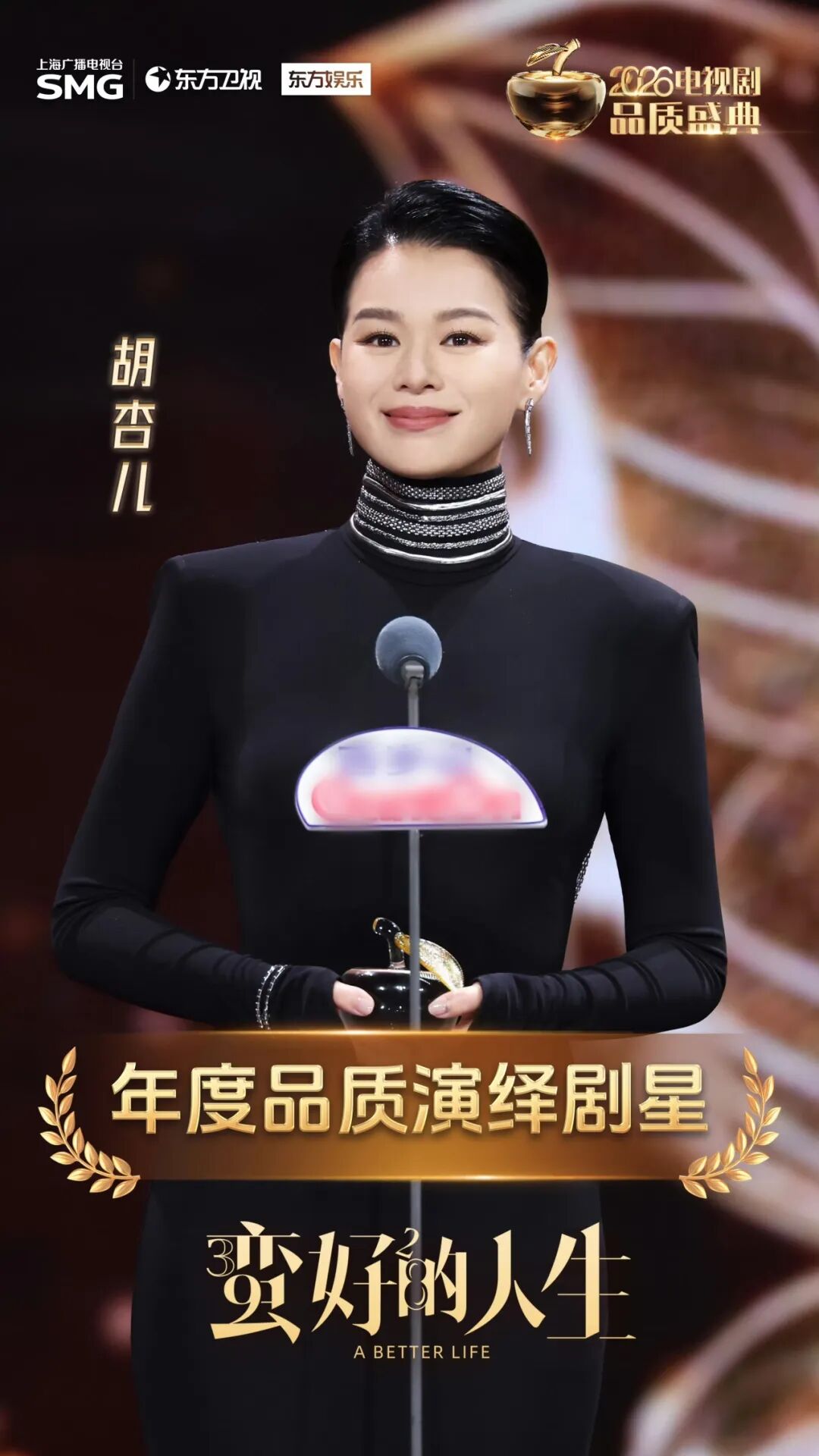 剧耀东方 2026电视剧品质盛典 星光聚首,品质铸魂!昨晚,2026上海影视创制大会系列活动——《剧耀东方•2026电视剧品质盛典》在东方卫视播出。各大剧组主创齐聚现场,共赴荣耀之约,摘得属于他们的“品质之果”。 由上海广播电视台荣誉呈现,中央电视台、东方明珠旗下尚世影业、优酷联合出品的都市民生话题剧《蛮好的人生》大放异彩,一举斩获“年度品质榜样剧作”“品质静安年度荣誉剧作”两大重磅剧集奖项,同时包揽“年度卓越品质之星(孙俪)”“年度品质演绎剧星(胡杏儿、高鑫)”“年度品质导演(汪俊)”“年度品质原创编剧(费慧君)”五项主创荣誉,以7项大奖的亮眼成绩,成为本届盛典当之无愧的品质赢家与剧集标杆。