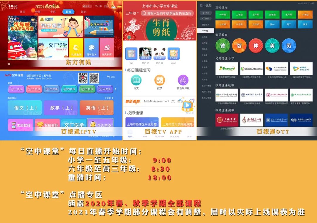 空中课堂作为上海市教委与东方明珠长期合作打造的特色教育品牌,目前已积累了近10000节电视课程,实现从小学到高中全学年全课程全覆盖。新学期将配合教材变更情况,对1000余节课程内容进行更新和上线,让空中课堂不仅仅成为教学的同步在线课堂,更成为优质的系统教学资源库。
