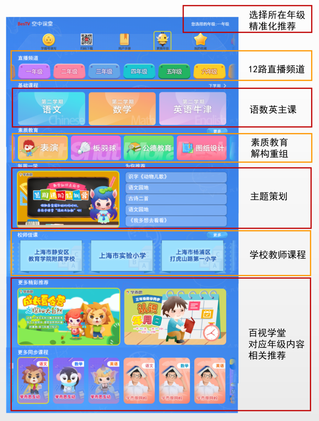 针对学生不同类别的学习重点,空中课堂进一步优化编排,对教学内容重新整合编辑,提炼课程节目中有趣的知识点,按照基础教育和素质教育分门别类,精选各学科知识点、例题讲解、课堂总结和学习经验,系列视频内容与教材保持同步,内容每周持续更新,方便学生查漏补缺、巩固学习。