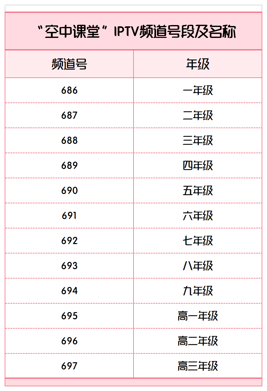 有线电视直播频道序列号为86到97,百视通IPTV直播频道序列号为686到697,分别对应小学至高中12个年级。移动端用户可在App store或各大安卓应用市场下载百视TV的APP和Pad版。OTT用户可在各大智能电视厂商的应用商店下载安装BesTV优视猫再进入“空中课堂”专区学习。