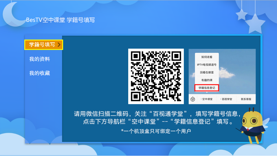 长按二维码,关注“百视通学堂”公众号,通过消息栏地址,或下方导航栏“空中课堂”--“学籍号填写”填写信息。19位学籍号和姓名为必填项,显示【认证成功】即提交,一个微信号可绑定一个用户,如需修改信息,可重新填写后提交。