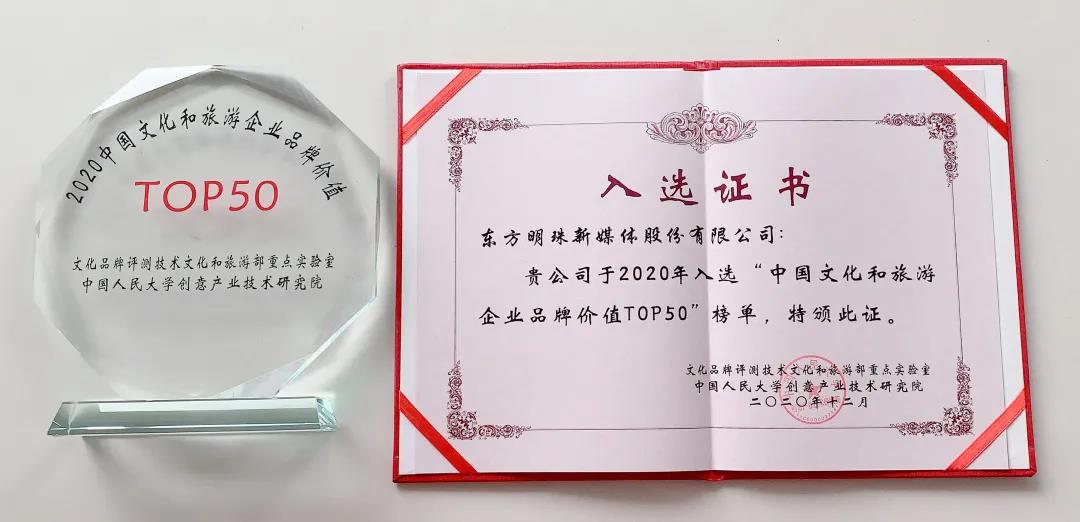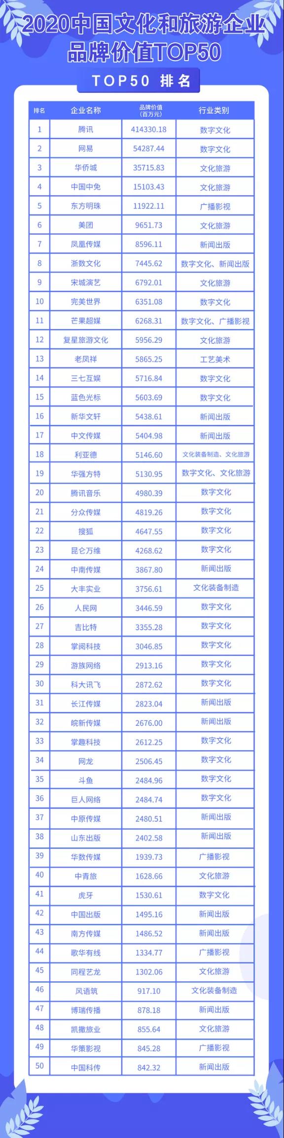 中国文化企业品牌价值TOP50榜单由文化品牌评测技术文化和旅游部重点实验室、中国人民大学创意产业技术研究院联合研发,自2015 年开始发布以来,已经在业界形成相当的影响力,成为反映我国文化和旅游企业品牌成长势能的重要依据。