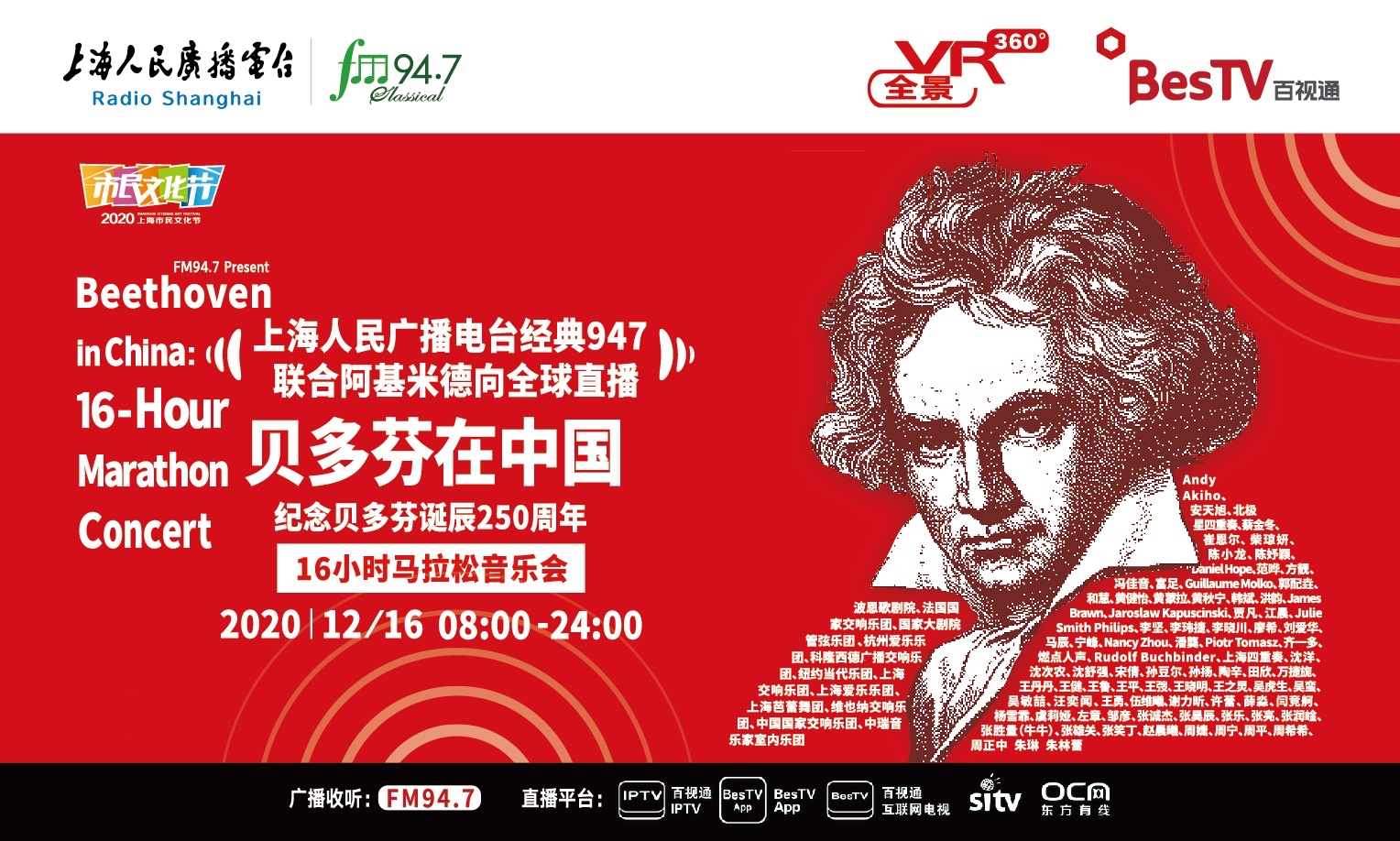 2020年是被称为“乐圣”、“交响乐之王”的著名作曲家贝多芬诞辰250周年,在12月16日纪念日当天,东方明珠新媒体股份有限公司旗下百视通、上海人民广播电台经典947频率、话匣子FM和阿基米德APP,共同推出《贝多芬在中国——纪念贝多芬诞辰250周年16小时马拉松音乐会》。