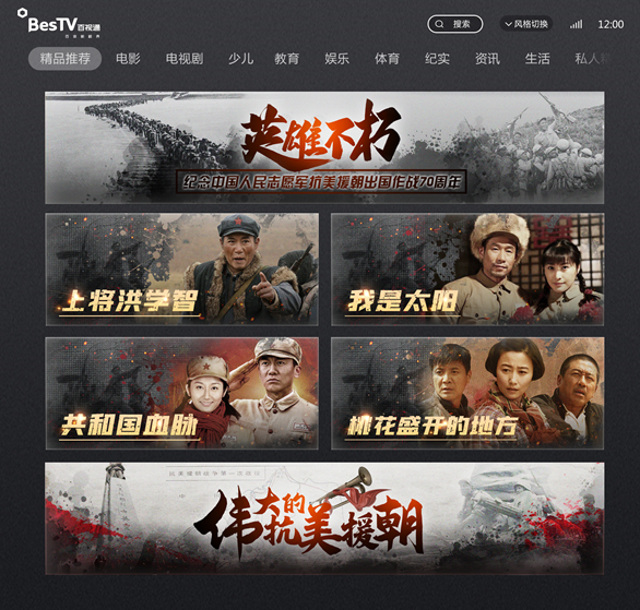 在主题宣传上小屏与大屏积极共振,BesTV APP结合移动端特点,在首屏策划推出主题专区“不能忘却的记忆”,为观众推荐呈现一系列优秀的经典国产电影、电视剧和纪录片,通过丰富的题材表现和内容维度立体展现了70年前中国人民志愿军战士用青春和热血写就的保家卫国的光辉篇章。