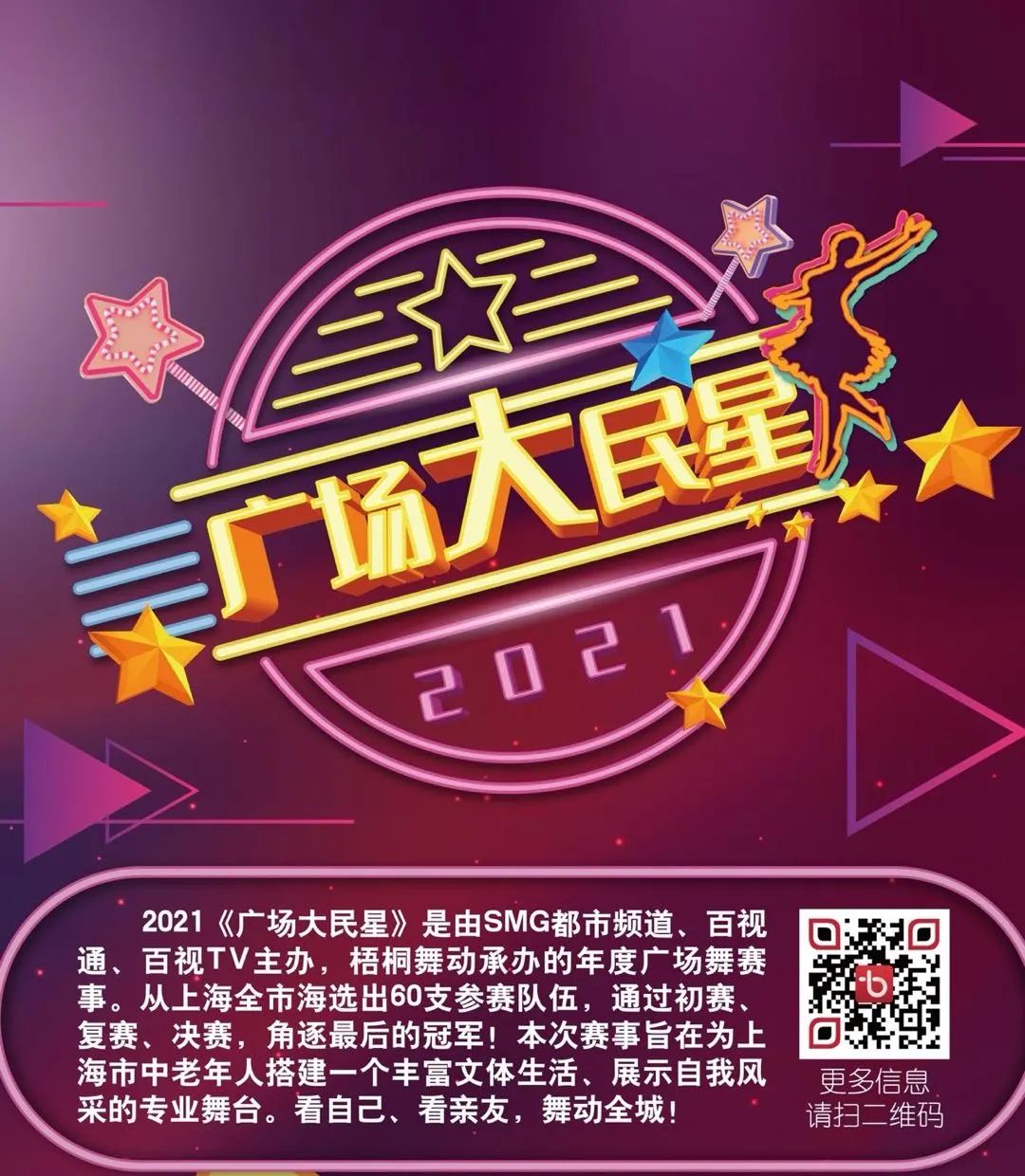 《广场大民星》自5月启动持续至今年12月,将从上海全市海选出60支参赛队,通过初赛、复赛、决赛角逐最后总冠军。所有参赛队伍都将获得由主办方颁发的电子纪念证书,晋级决赛未获前三名的队伍将获得纪念证书,冠亚季军队伍还有奖杯和奖品!