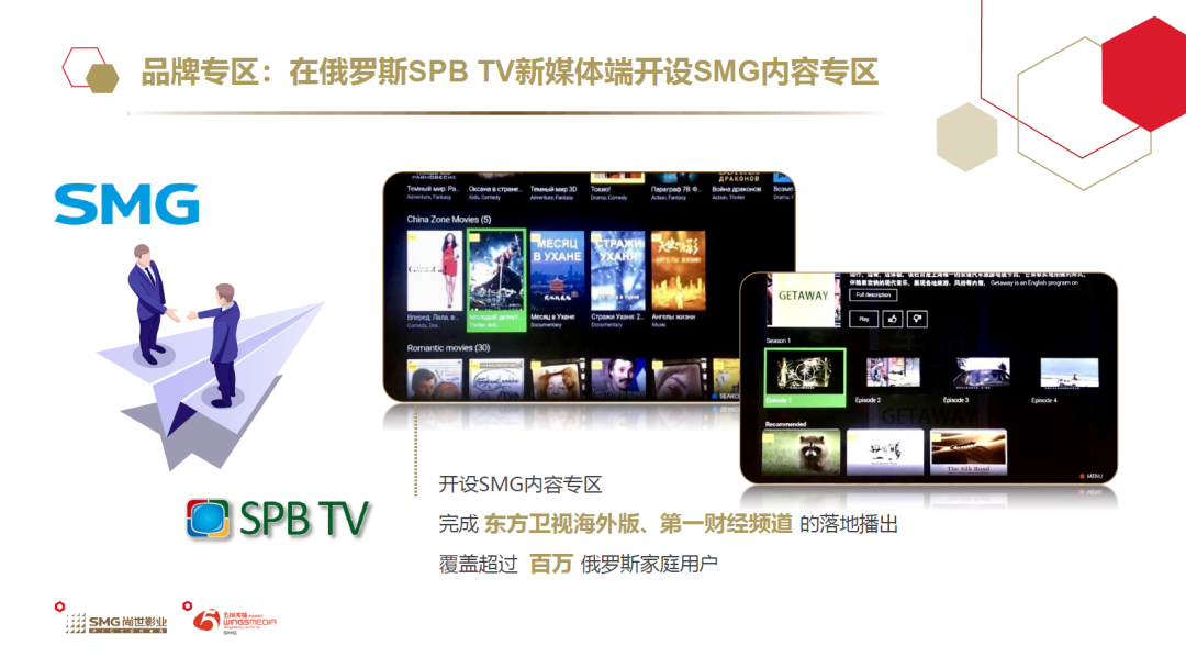 在自建的北美全媒体传播矩阵中,开辟了“上海故事”系列品牌栏目,专为北美民众讲述上海的故事;为SMG优质纪录片开辟专属航线,助力《习近平治国方略:中国这五年》《海上丝绸之路》等在“一带一路”国家播出;推进与俄罗斯SPB集团合作,开设SMG内容专区,实现了东方卫视海外版和第一财经频道的落地播出,覆盖超百万俄罗斯家庭用户。