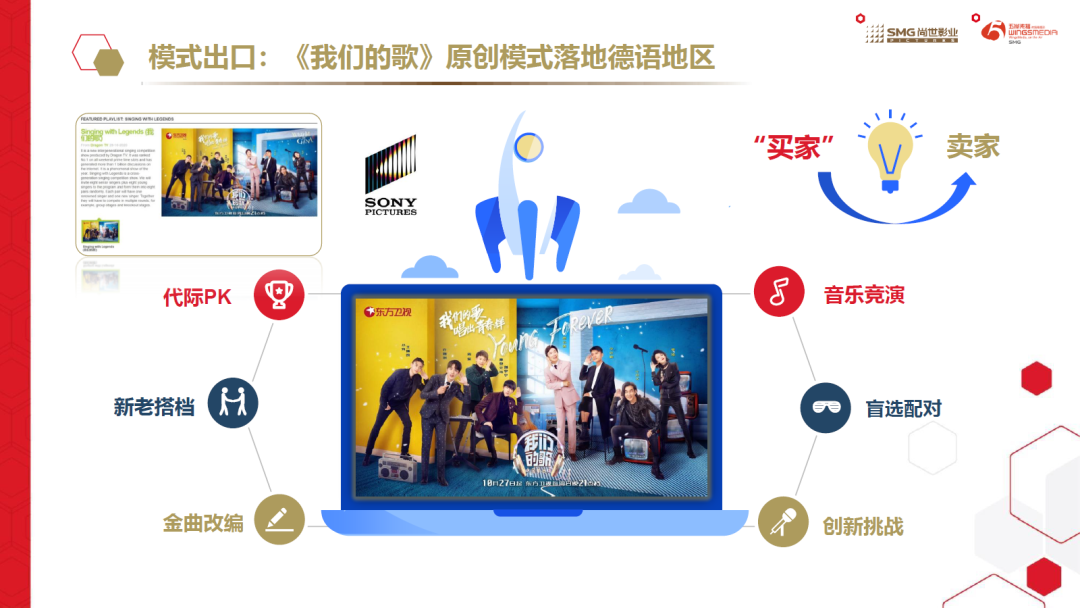 节目发行方面,去年11月,尚世五岸就东方卫视自主研发的综艺《我们的歌》原创模式,与索尼影视德国公司签署了授权协议,进行《我们的歌》(德语版)的发行、制作。未来,德、奥、瑞士等德语地区的唱将与新声歌手将按照上海研发的节目模式完成竞演。这是中国综艺模式的从“买家”向“卖家”的华丽转身,彰显了国产综艺的国际化水平。