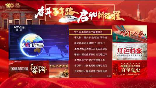 百视通IPTV、OTT全力保障重大活动转播,广泛汇聚包括资讯、纪实、文艺等各类庆祝建党百年节目,落实首页首屏首条建设,上海IPTV、OTT平台统一上线庆祝中国共产党成立100周年开机页面和“建党百年”主题EPG底图,将同庆百年华诞、共铸历史伟业的浓厚氛围推向顶峰。
