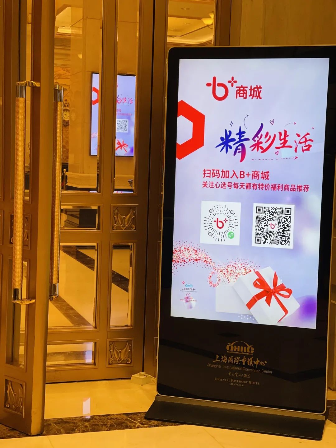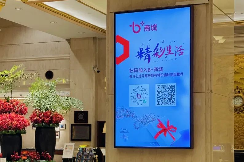 东方滨江大酒店多处公共区域的信息屏、多个餐厅内等人流量聚集的地方,全面铺设B+宣传物料,引导客人下载“百视TV”APP,充分利用线下游客资源,将酒店线下宾客引流至B+平台。