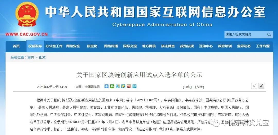 12月22日,《关于国家区块链创新应用试点入选名单的公示》公布,经中央网信办、中央宣传部、国务院办公厅[电子政务办公室]、最高人民法院、最高人民检察院、教育部、工业和信息化部、民政部、司法部、人力资源社会保障部、国家卫生健康委、中国人民银行、国家税务总局、中国银保监会、中国证监会、国家能源局、国家外汇管理局等17个单位和部门的专家评审,东方明珠新媒体股份有限公司(东方明珠新媒体)入选国家区块链创新应用试点名单。公示期为2021年12月21日至2021年12月28日。
