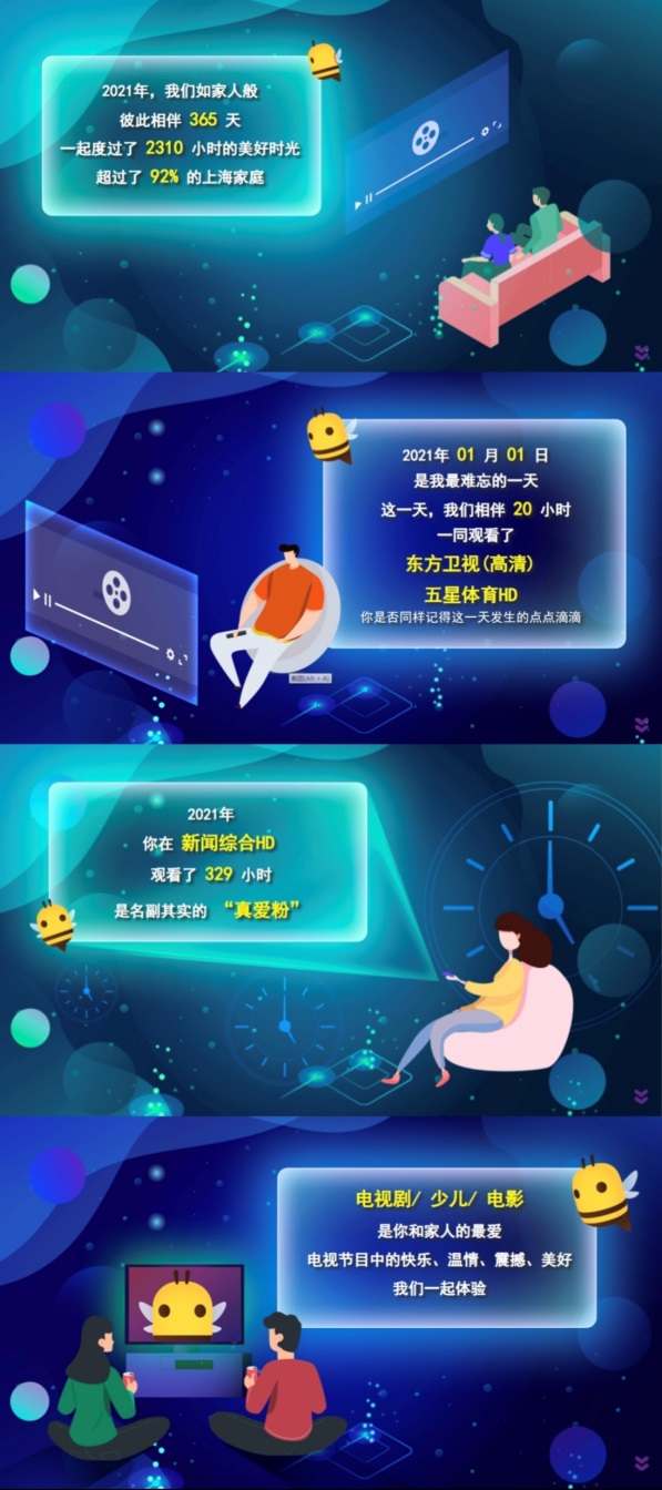 此次推出“上海IPTV年度收视报告”,旨在为用户带来更新更好的收视体验。用户看到的每份收视报告都是独一无二、独家定制的,百视通上海IPTV通过“数智化”运营的方式感恩用户2021年的相伴,记录下大屏节目给用户带来的快乐、温暖、震撼等各种美好体验。