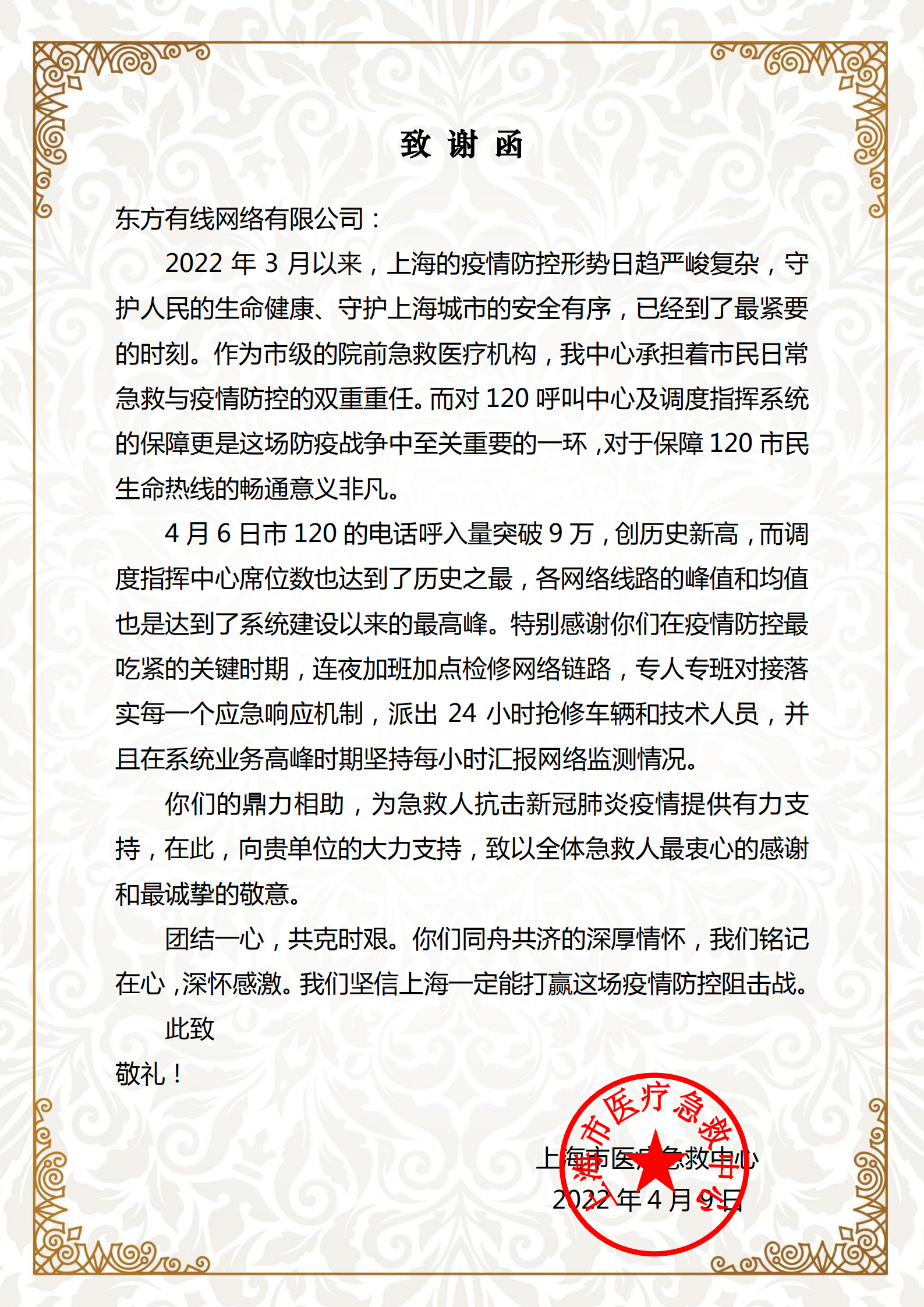 4月1日起,随着全市核酸筛查工作的展开,120网络通信流量连续冲高。4月6日,120电话呼入总量突破9万,创历史新高;调度指挥中心席位数翻倍,达到历史之最;网络峰值流量近1000M,达到系统建设以来的最高峰。东方有线成功运用网络数字化分析管理工具,第一时间回溯原始数据,快速协助120定位故障,并实现电子政务云内加密服务系统进程优化,解决了高峰期出现的网络流量突峰、话务抖动等情况,平稳度过话务历史高峰,赢得了上海市医疗急救中心的感谢和信任。
