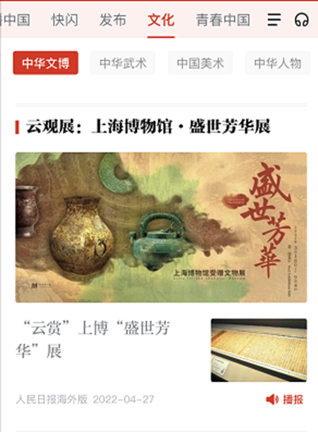 打开“学习强国”App,点击打开“文化”板块,进入“中华文博”频道,下拉就可以看到 “云观展:上海博物馆·盛世芳华展”专题。