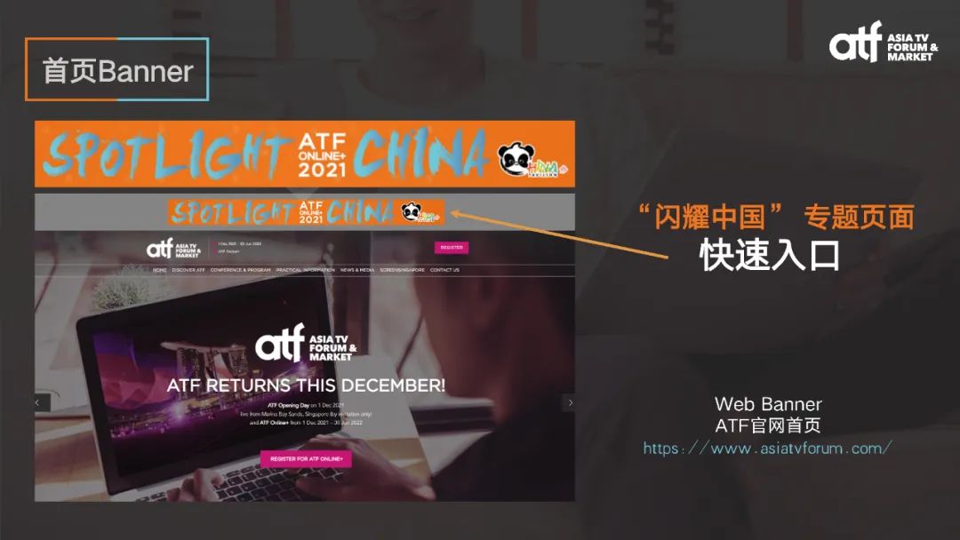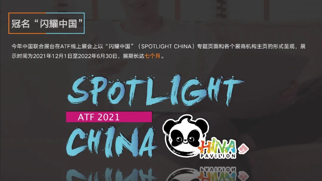 在新加坡电视节线上展会(ATF Online+)上,“中国联合展台”以“闪耀中国”(SPOTLIGHT CHINA)专题页面和各个展商机构主页形式呈现,展示时间为2021年12月1日至2022年6月30日,长达7个月。参加“中国联合展台”的中国机构共计30家,展示优秀中国作品约200部,其中电视剧99部、动漫75部、纪录片12部、综艺9部。