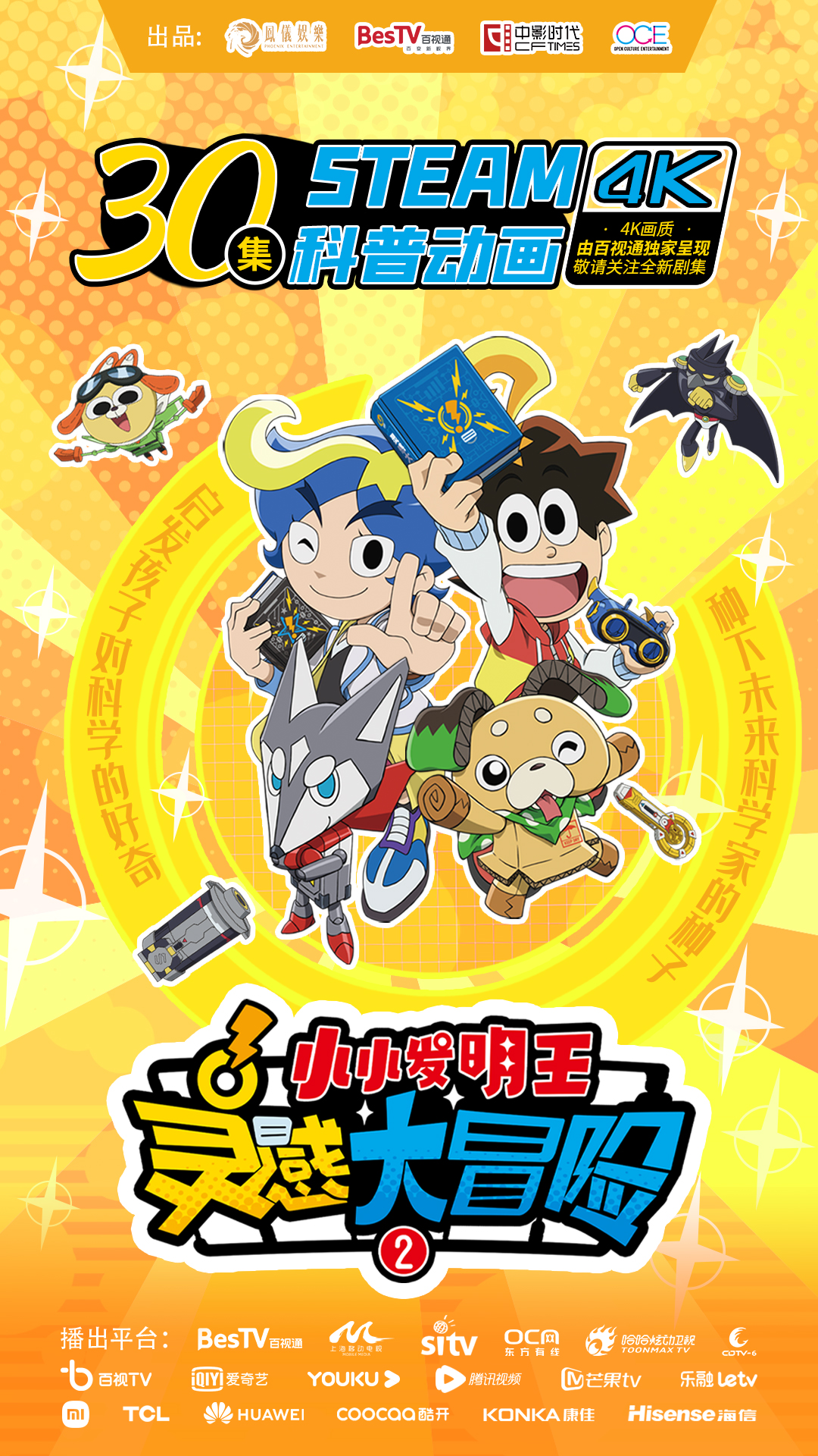 8月8日,由东方明珠新媒体旗下百视通联合出品的30集STEAM科普动画《灵感大冒险》第二季《灵感大冒险2小小发明王》正式上线播出,适合幼儿园中班至小学五年级孩子观看。每天16:00,剧中主人公“小艾迪”将在百视通IPTV、OTT,东方有线点播专区,百视TV APP,上海地铁及公交日均覆盖500万出行人口的上海移动电视等平台与小朋友们准时见面!一起用1%的小小灵感,创造出大大的发明!开启一场灵感和好奇心的冒险之旅吧!