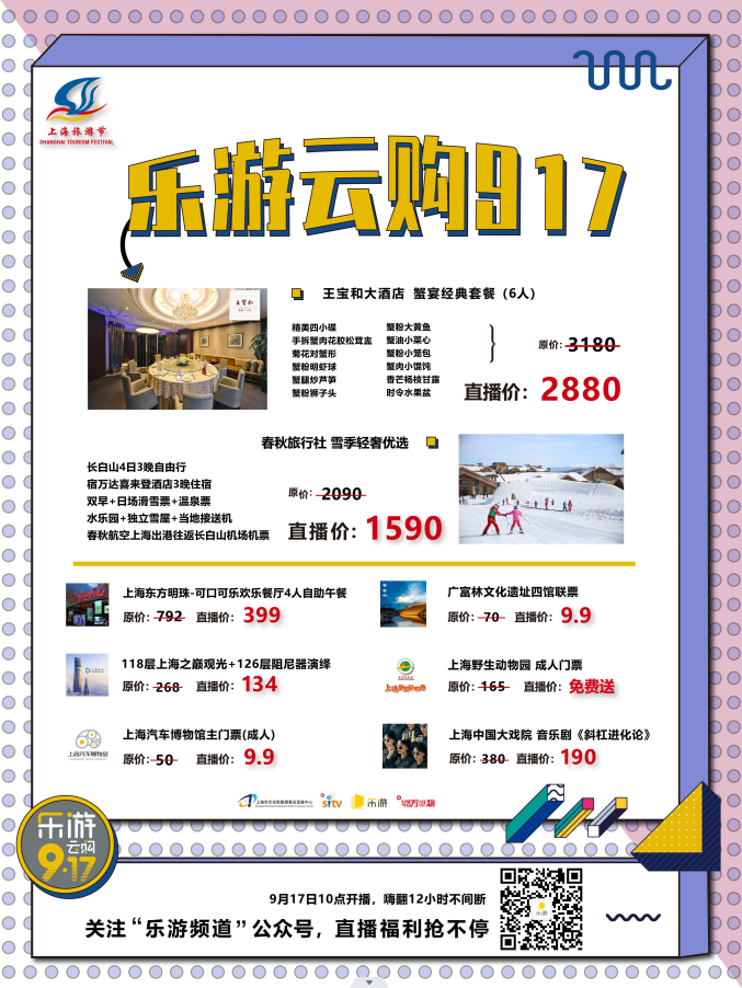 围绕“人民大众的节日”办节主题,“乐游云购9·17”大直播将集中推出一批惠民利民产品,包括精选旅游线路、景区(点)、演艺展览、文创产品等文旅产品。作为点燃本次文旅消费季热度的首场线上活动,大直播将于9月17日上午10点启动,分为公益直播带货和文旅推介专场。