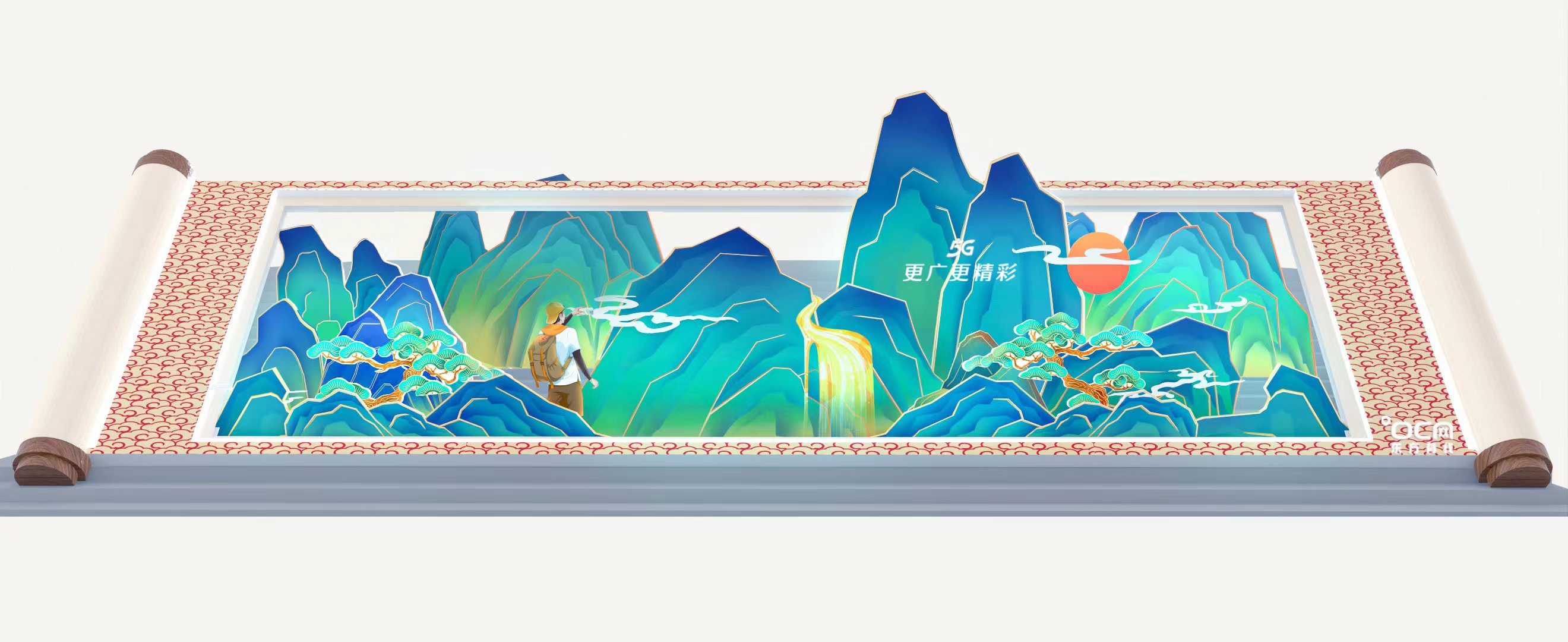 “带着游客穿梭于画卷之中”是这个作品的设计理念。沉淀的苍绿、沉稳的翠绿、抽芽的新绿……色彩层次丰富而有质感,还原了山河图的古韵气质。抬头观览明珠塔,又是另外一番体验,仿佛你我在同样的天空下,不同的时代里,共同仰望着这一片山河。