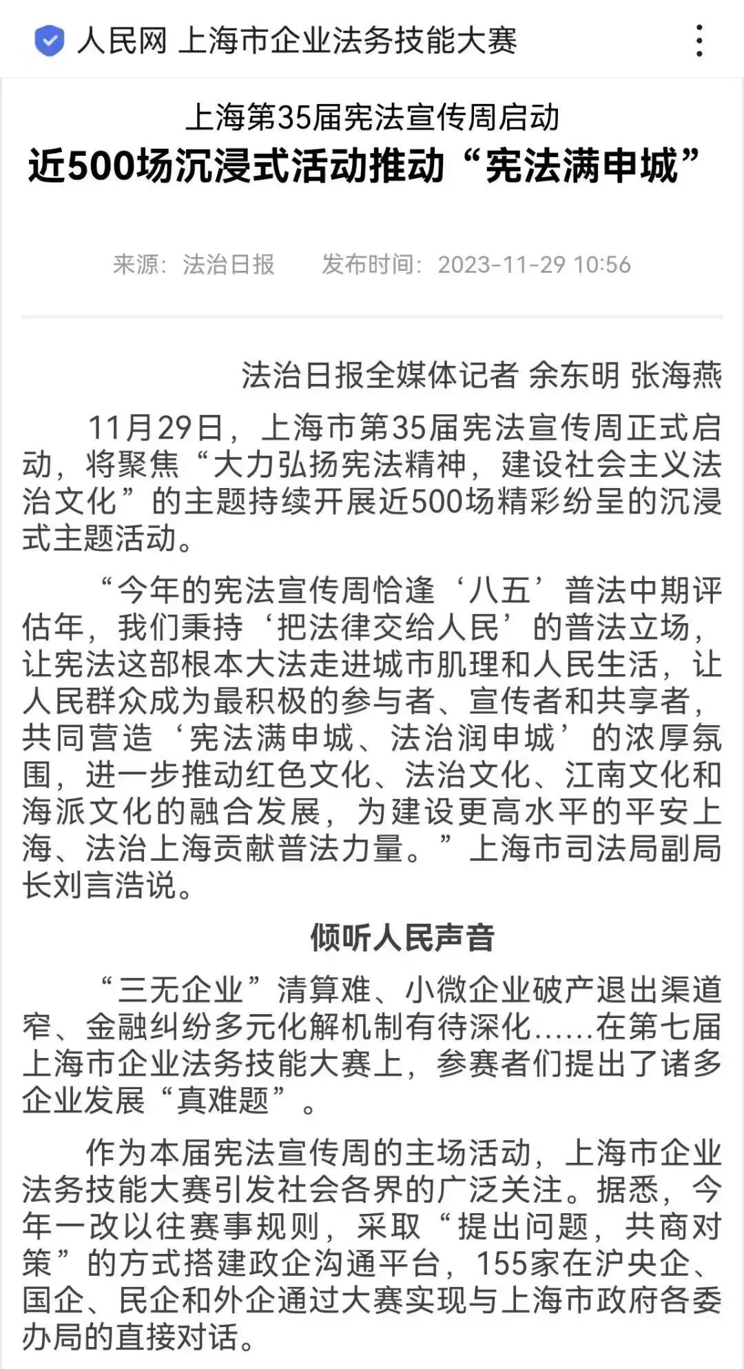 11月29日,由文广互动法治天地频道承办的第七届上海市企业法务技能大赛决赛在上海邮政博物馆举办。作为今年上海宪法宣传周的重头戏,大赛以“优化法治化营商环境,赋能企业高质量发展”为主题,结合企业法治文化建设,集中展示了依法治企成果。