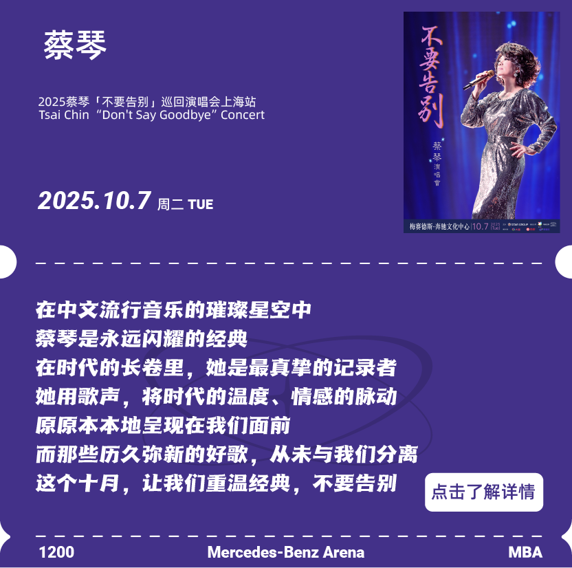 作为上海最具代表性的文化演艺地标之一,梅赛德斯-奔驰文化中心凭借国际一流的硬件设施、强大的场馆承载力与专业的服务能力,持续吸引全球顶尖艺人与顶级赛事纷至沓来。这个秋天,来梅奔,开启你的专属狂欢,共赴每一场不容错过的高能现场!