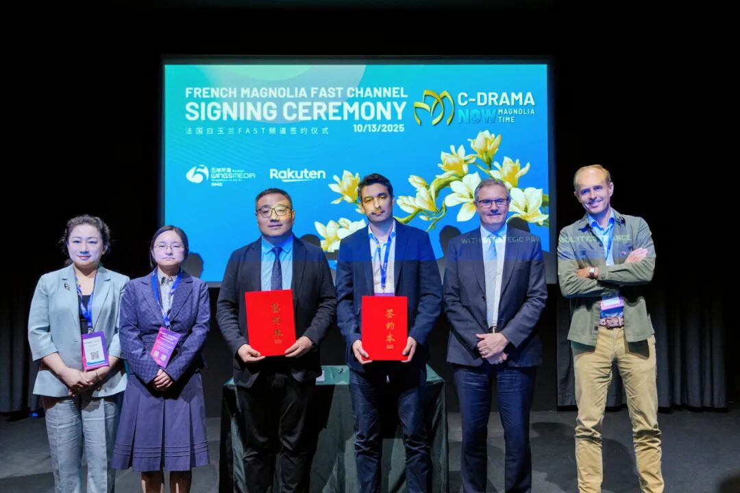 在随后的签约仪式上,五岸传播与法国Rakuten TV就联合打造“法国白玉兰FAST频道”正式签约。这是首个落地法国的中国内容FAST频道,辐射欧洲43个国家和地区。该项目率先构建了中法视听合作的全新模式,在探索中国内容国际化新路径的同时,有力推动了中法文化交流互鉴。