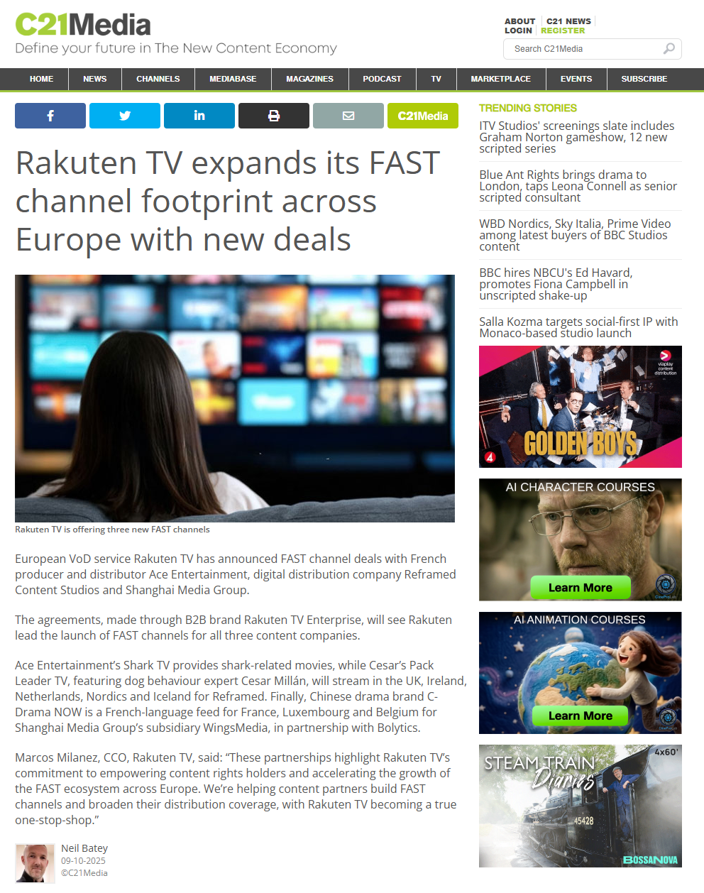 作为首个在法国主流平台常态化运营的亚洲内容FAST频道,法国白玉兰FAST频道不仅是中国内容走向欧洲的视听窗口,更是连接中法文化的重要桥梁。频道采用国际主流的免费广告支持流媒体电视(FAST)模式,通过 “内容授权+技术托管+广告分账+本地运营”的创新合作机制,对接Rakuten TV成熟的基础设施,实现了内容管理、播出编排、广告插入和数据反馈的完整运营闭环,为中国视听内容在海外市场的价值转化与长期发展探索了一套可持续发展模式。